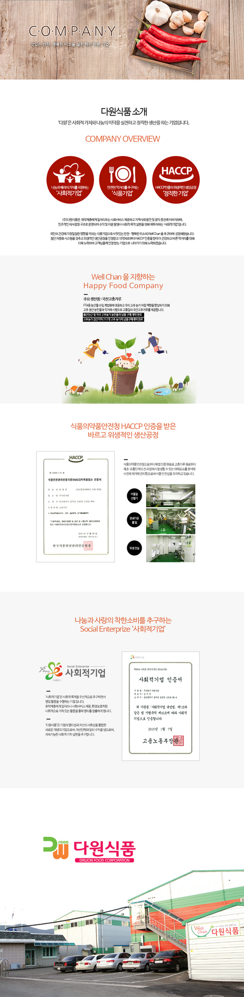 (주)다원식품은 취약게층에게 일자리 또는 사회서비스를 제공하고 지역사회 발전 및 공익 증진에 이바지하며, 민주적인 의사결정 구조로 운영되어 수익 및 이윤 발생 시 사회적 목적 실현을 위해 재투자하는 '사회적 기업'입니다.
