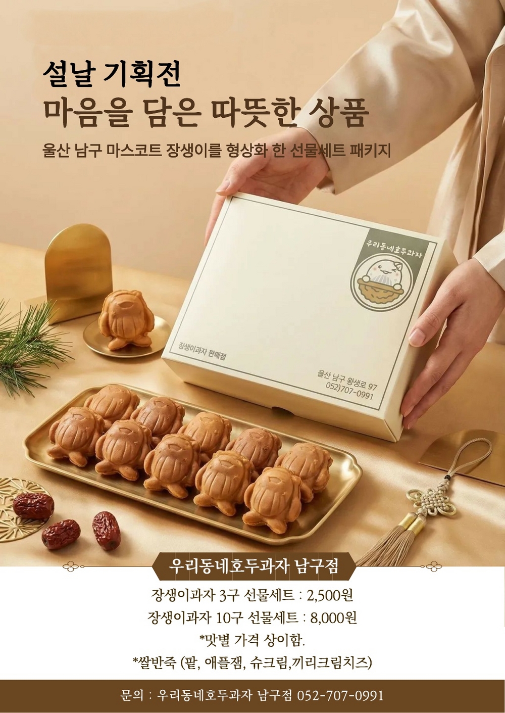 고소한 호두과자와 귀여운 남구 캐릭터 장생이과자 판매와 다양한 카페 음료를 제공하고 있습니다.