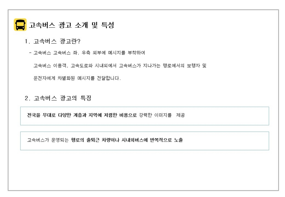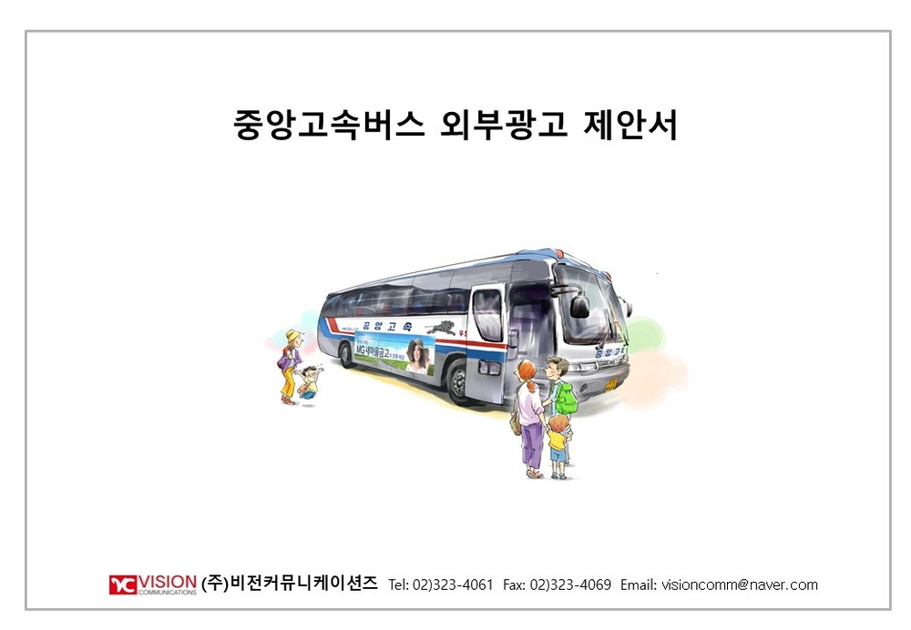 | 기업소개 | 안녕하세요. 중앙고속버스 외부광고를 하고 있는 (주)비전커뮤니케이션즈입니다. 고속버스 광고응 버스 좌우측 외부에 메시지를 부착하여 고속버스가 다니느 행로에서 보행자 및 운전자에게 메시지를 전달합니다. 고속버스 광고는 모든 매체중 가장 장거리 이동을 하며 모든 교통인구에게 노출이되며, 최적의 가시거리를 갖는 최고의 광고 효과를 갖고 있는 매체입니다. |