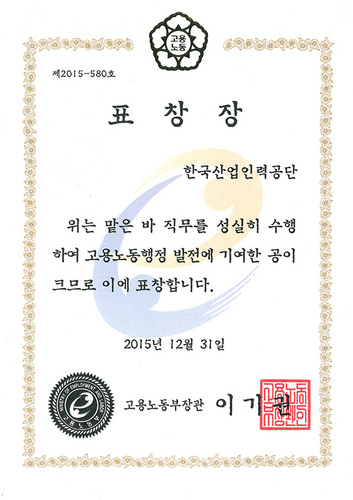 공단은 2015년도 충무계획 및 을지연습 발전에 기여하여 비상대비 분야 업무발전을 도모한 공을 인정받아 고용노동부장관 표창을 수상했다.