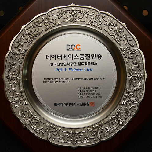 공단에서 운용하는 월드잡플러스DB는 99.99%의 데이터 정합률을 달성하고 각 부처별로 산재해 있던 해외진출 관련 정보를 하나로 모아 운영하는데 크게 기여한 공로를 인정받아 데이터인증(DQC-V)분야의 최고등급인 플래티넘(Platinum) 등급을 획득했다.