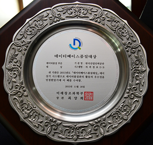 공단에서 자격정보DB는 국가자격시험의 접수부터 자격증 발급까지 원스톱으로 제공하고 있는 Q-net의 핵심정보로 99.99%의 데이터 정합률을 달성하는 등 대국민 공공DB로서 가치를 인정받아 미래창조과학부 주최 <2015년도 데이터베이스품질대상> 데이터품질 부문에서 대상을 수상했다.
