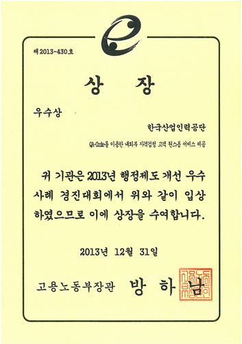 공단은 고용노동부에서 주관한 <2013 행정제도 개선 우수사례 경진대회>에서 ‘QR코드를 활용한 내·외부 자격검정 고객 원스톱 서비스 제공’ 등 능력개발 및 능력평가(자격), 숙련기술장려, 외국인고용지원, 해외취업사업 관련 수요자와 고객 중심의 제도 개선 우수사례를 제출하여 고용노동부장관을 수상했다.