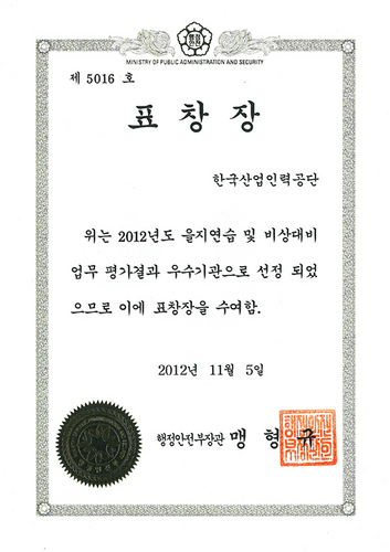 공단은 2012년도 을지연습 시 전 직원의 열외 없는 연습 참여와 적극적인 을지연습 홍보, 계획적이고 조직적인 준비로 타 기관의 수범이 되어 행정자치부장관 표창을 수상했다.