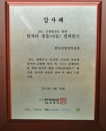 2012 공생발전을 위한 일자리창출(나눔) 컨퍼런스 감사패
