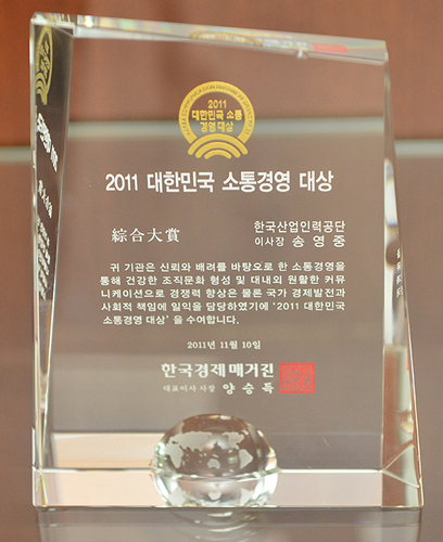 공단은 다양한 행복한 일터 만들기 프로젝트를 통하여 소통과 배려 중심의 조직문화를 만들고 대내외 원활한 커뮤니케이션으로 조직 경쟁력을 높인 점을 인정받아 <2011 대한민국 소통경영 대상>을 수상했다.