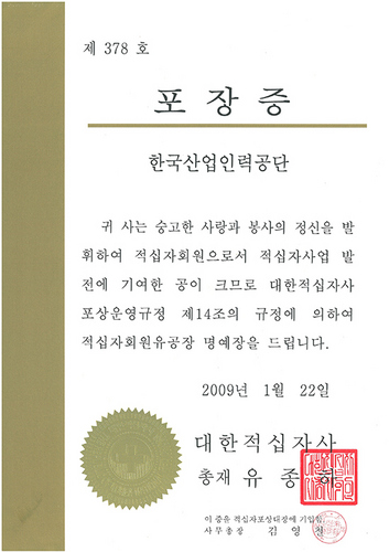 공단은 대한적십자사와 단체 헌혈 약정을 체결하고 연 2회 이상 헌혈운동을 전개하는 등 조직 차원에서 자발적이고 정기적인 헌혈에 동참하여 안정적인 혈액 수급에 기여한 공을 인정받아 대한적십자사로부터 적십자회원유공장 명예장을 수상했다.
