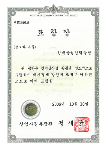 공단은 국가자격포털 큐넷 사이트를 비롯하여 국내 청년들의 해외취업을 지원하는 월드잡 사이트 등 국가 인적자원개발사업 관련 정보화부문의 경영생산성 향상과 우수한 성과 도출 등을 통하여 경제발전에 기여한 공을 인정받아 산업자원부장관 표창을 수상했다.