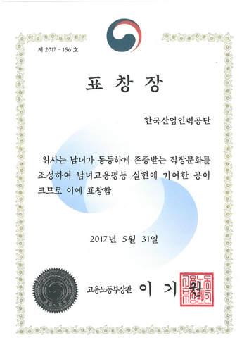 남녀고용평등 우수기관 표창장 수상
