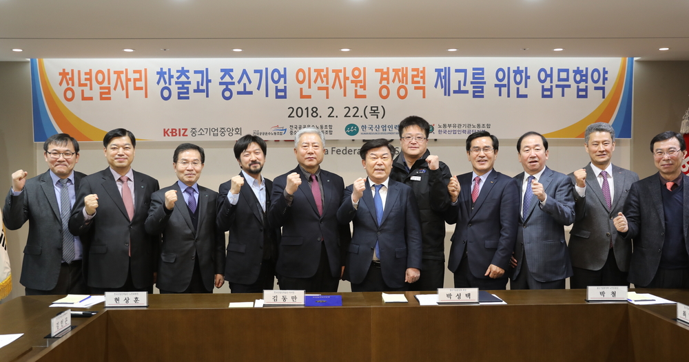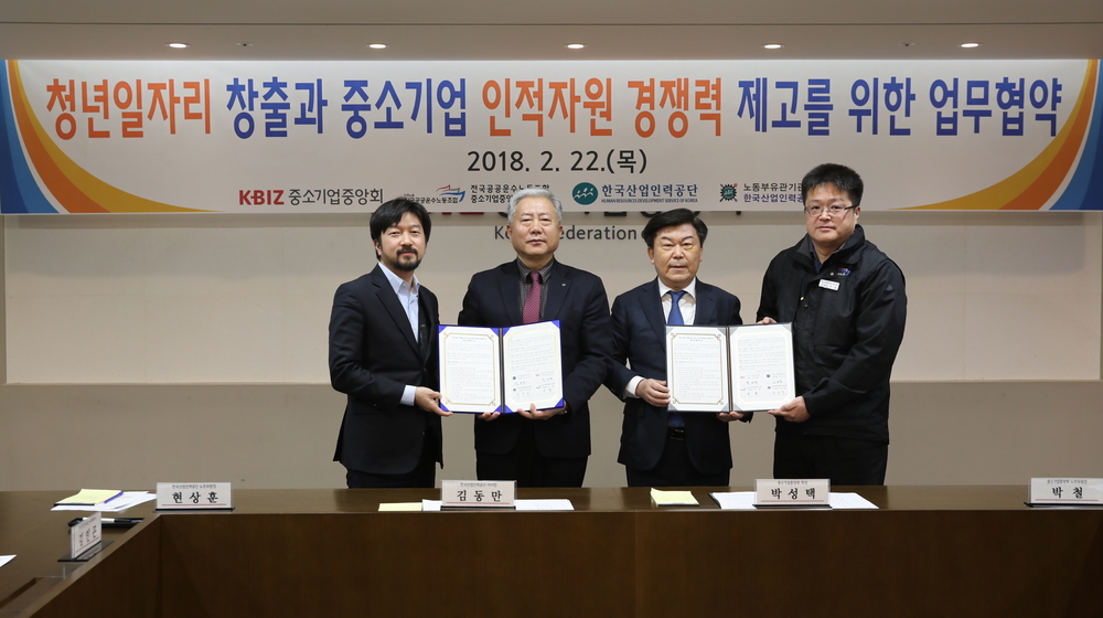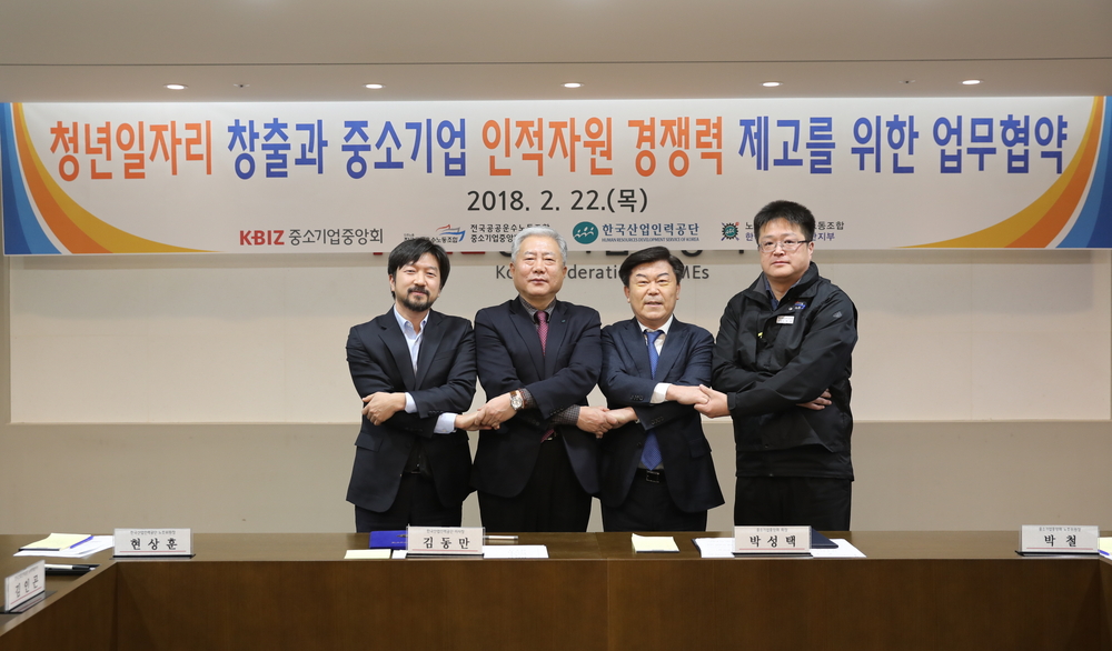 한국산업인력공단(이사장 김동만)과 중소기업중앙회(회장 박성택)는 22일, 중앙회 본부(서울 영등포구)에서 청년 일자리 창출과 중소기업의 인적자원개발 지원을 위한 업무협약을 체결했다. 이번 협약식에는 양 기관 대표와 함께 공단 현상훈 노조위원장, 중앙회 박철 노조위원장 등 노동조합 대표도 같이 참석해 중소기업 지원과 국민의 일자리 문제 해결을 위해 협업체계를 구축할 것을 약속했다.