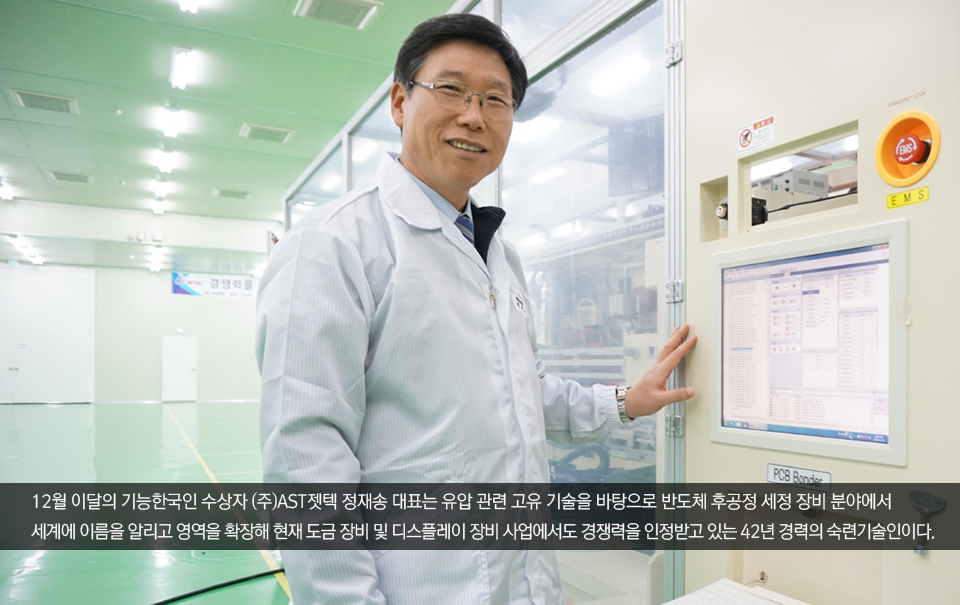 (주)AST젯텍은 수출이 매출의 약 70% 비중을 차지하고 있으며 향후 성진하이메크 인수와 함께 직원 390명, 매출액이 약 1000억 원 규모까지 성장할 전망이다. 또한 정 대표는 변화하는 산업 흐름에 발 빠르게 대응하기 위한 노력으로 기업부설연구소를 설립, 매출의 8%를 연구개발에 투자하는 등 지원을 아끼지 않으며 그 결과 지금까지 특허 58건, 실용신안 1건, ISO인증 1건 총 60건의 특허를 냈다.